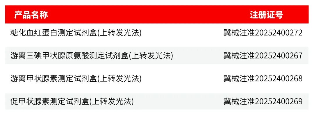 近日,熱景生物基于上轉(zhuǎn)發(fā)光(UPT)技術(shù)的 4 項醫(yī)療器械產(chǎn)品,成功拿下國家藥監(jiān)局《醫(yī)療器械注冊證》!此次獲批的甲功三項(FT3、FT4、TSH)與糖化血紅蛋白檢測項目,不僅是公司技術(shù)實力的權(quán)威認證,更將為臨床診療與慢性病管理帶來便捷新選擇。